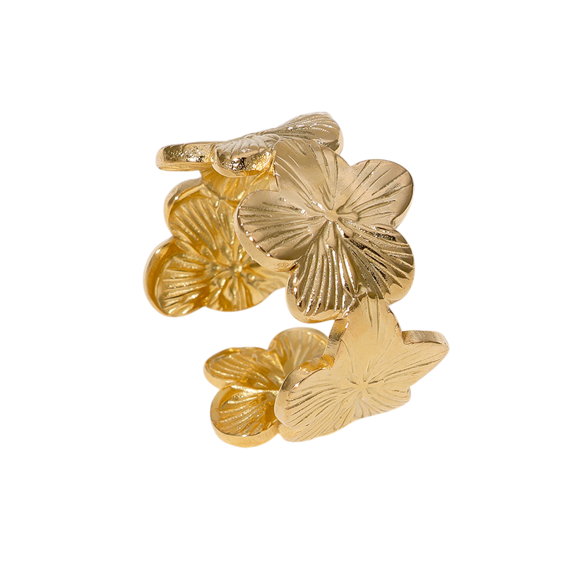 Anillo elaborado en acero inoxidable con recubrimiento PVD en tono oro. Su diseño de flores hawaianas en secuencia, de ajuste regulable, envuelve el dedo con una línea floral delicada que aporta un aire fresco, femenino y sofisticado.
