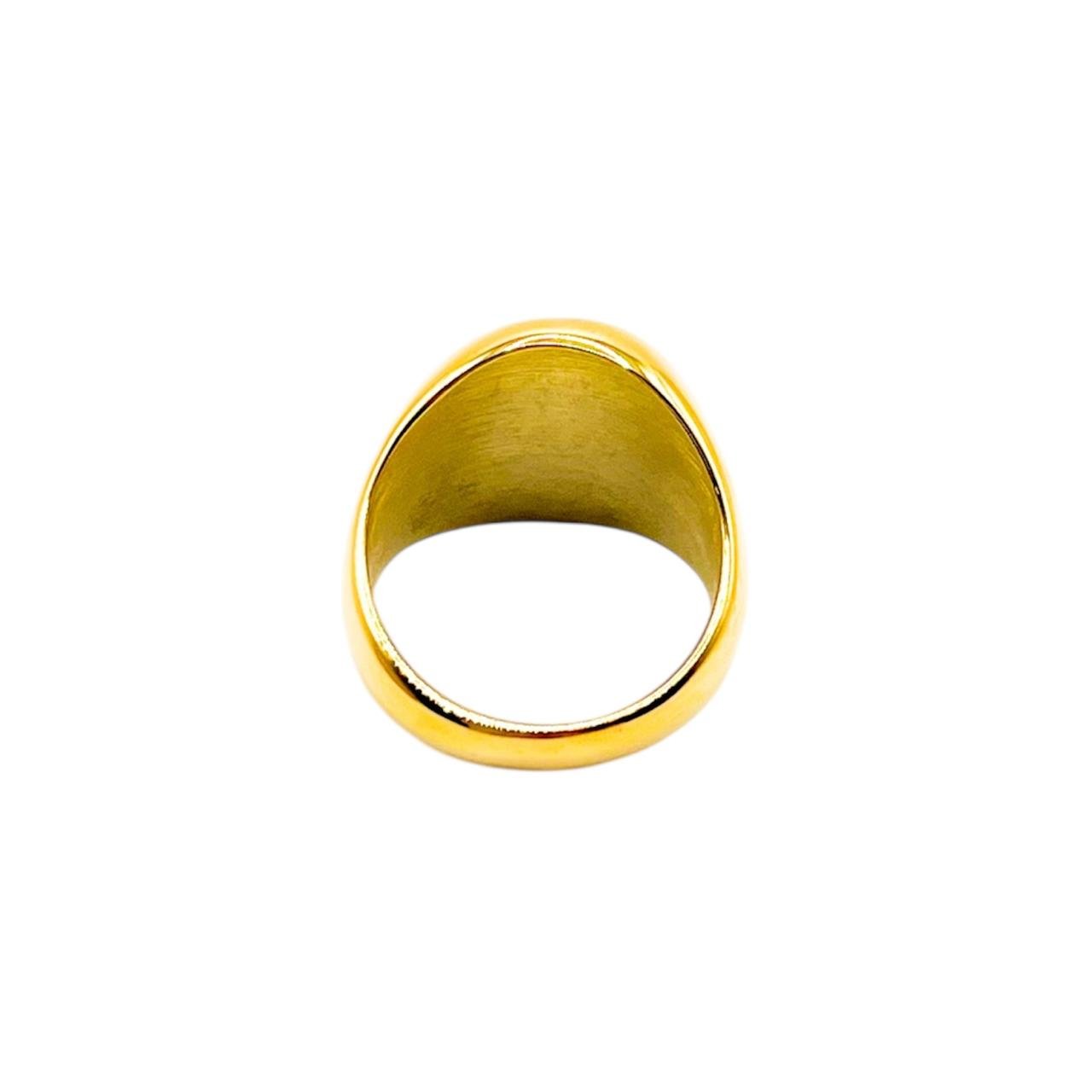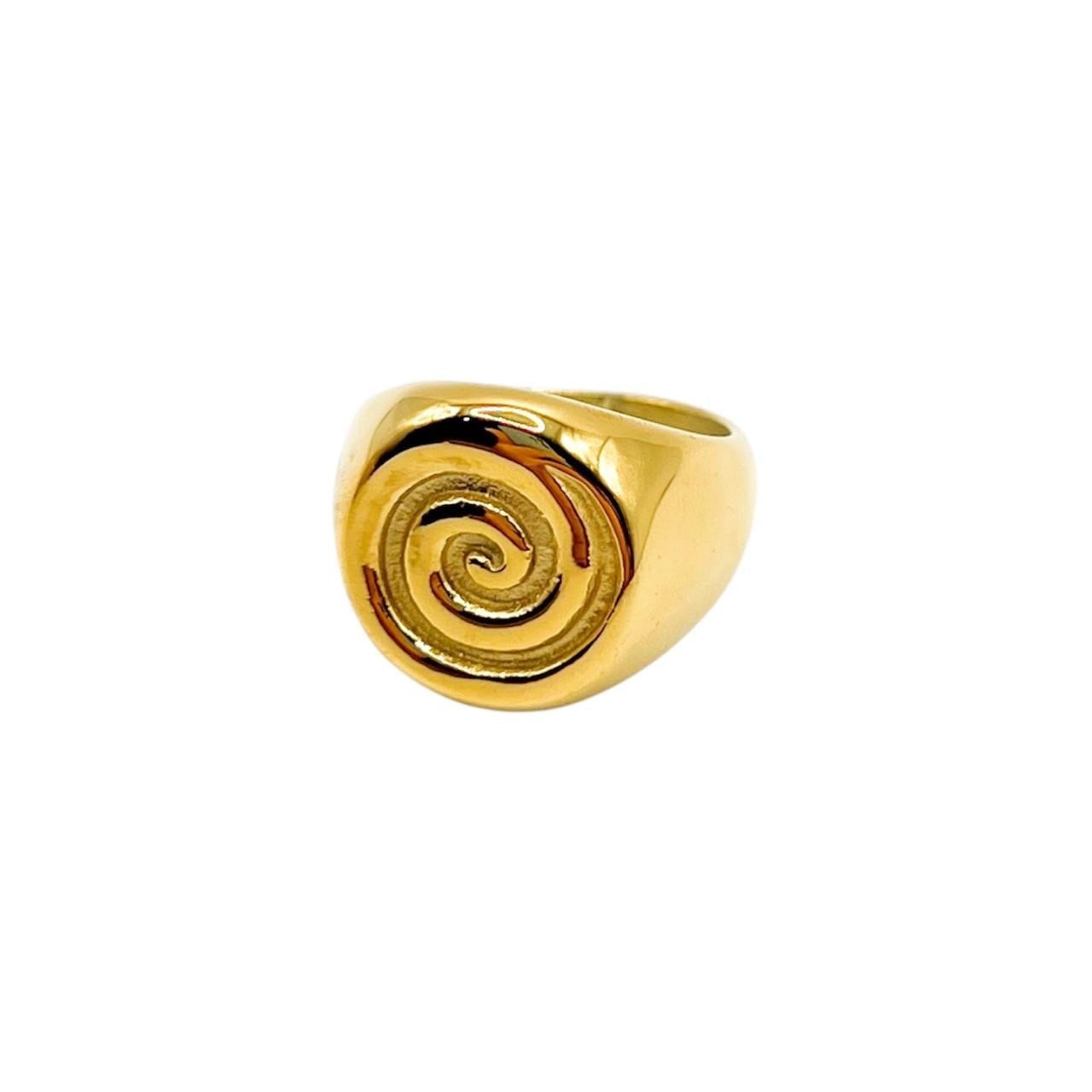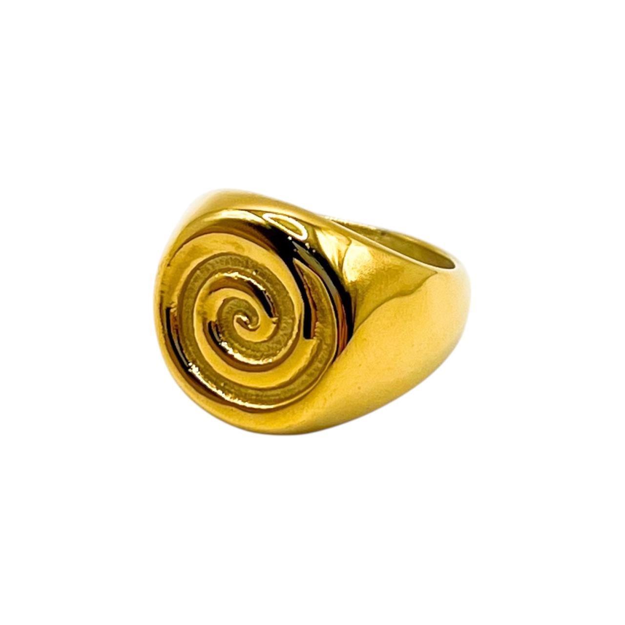 Anillo de acero inoxidable en acabado color oro, con un diseño frontal de remolino en relieve que aporta un estilo moderno y elegante. Su estructura pulida y su forma sólida lo convierten en una pieza llamativa pero versátil, ideal para complementar cualquier look con un toque distintivo. Perfecto para uso diario gracias a su durabilidad y brillo resistente.