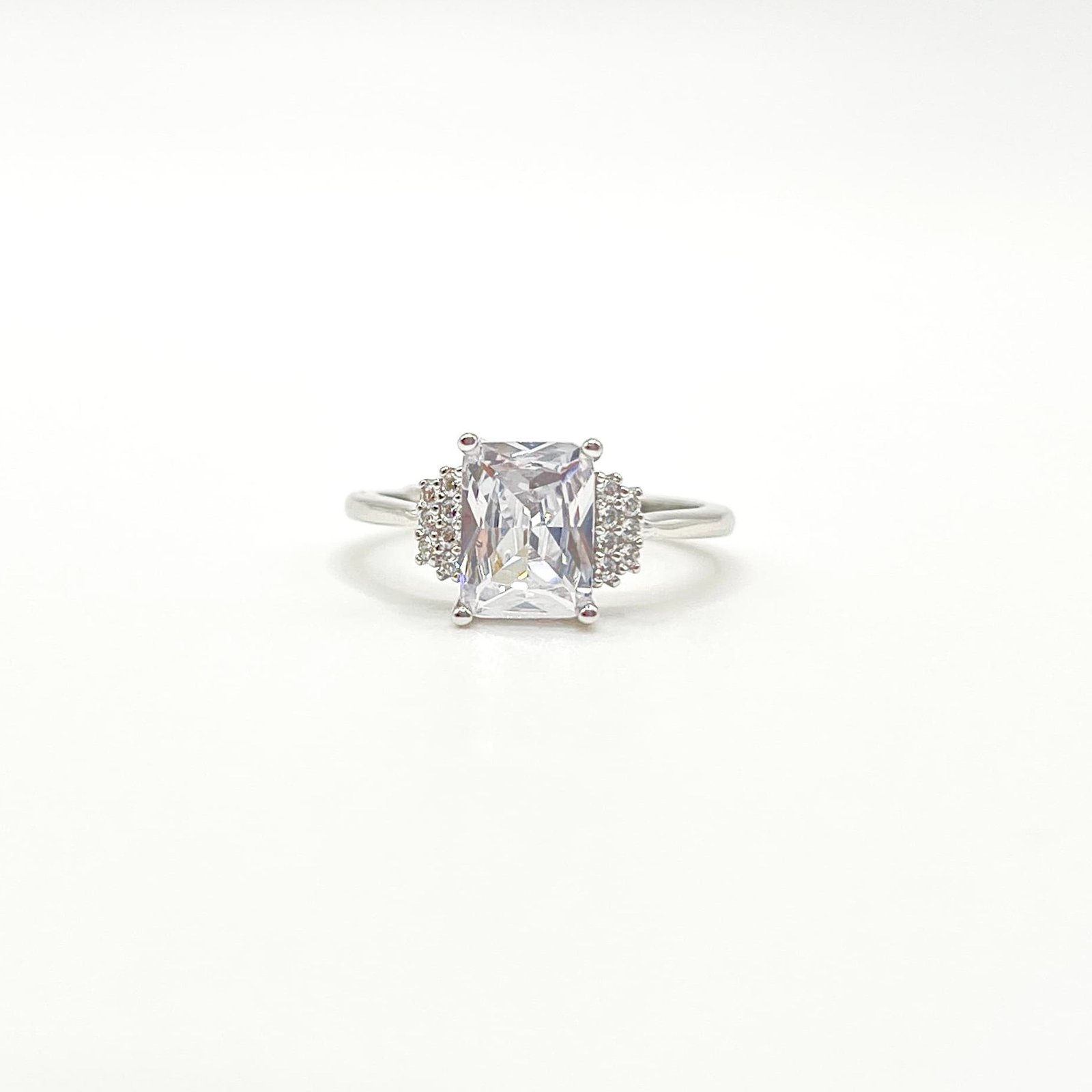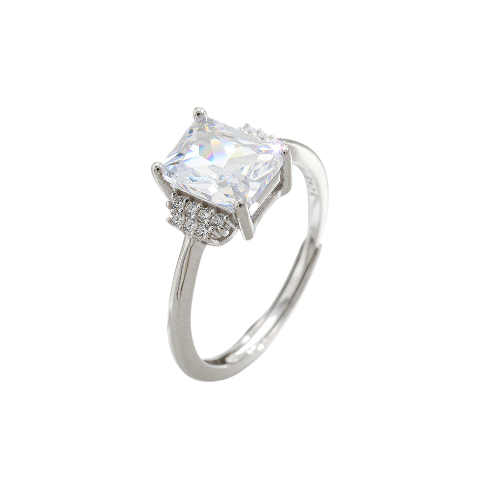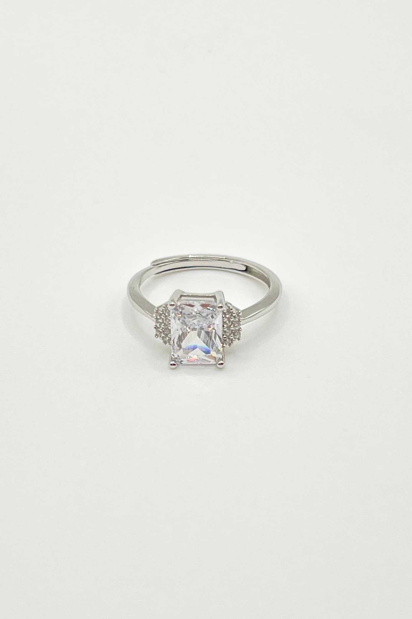 Anillo elaborado en plata 925, en tono plata con recubrimiento PVD, de ajuste regulable. Presenta un circonia central cuadrada de alto brillo, acompañado por circones diminutos en dos de sus extremos, creando un diseño equilibrado y luminoso que enmarca la pieza con elegancia.