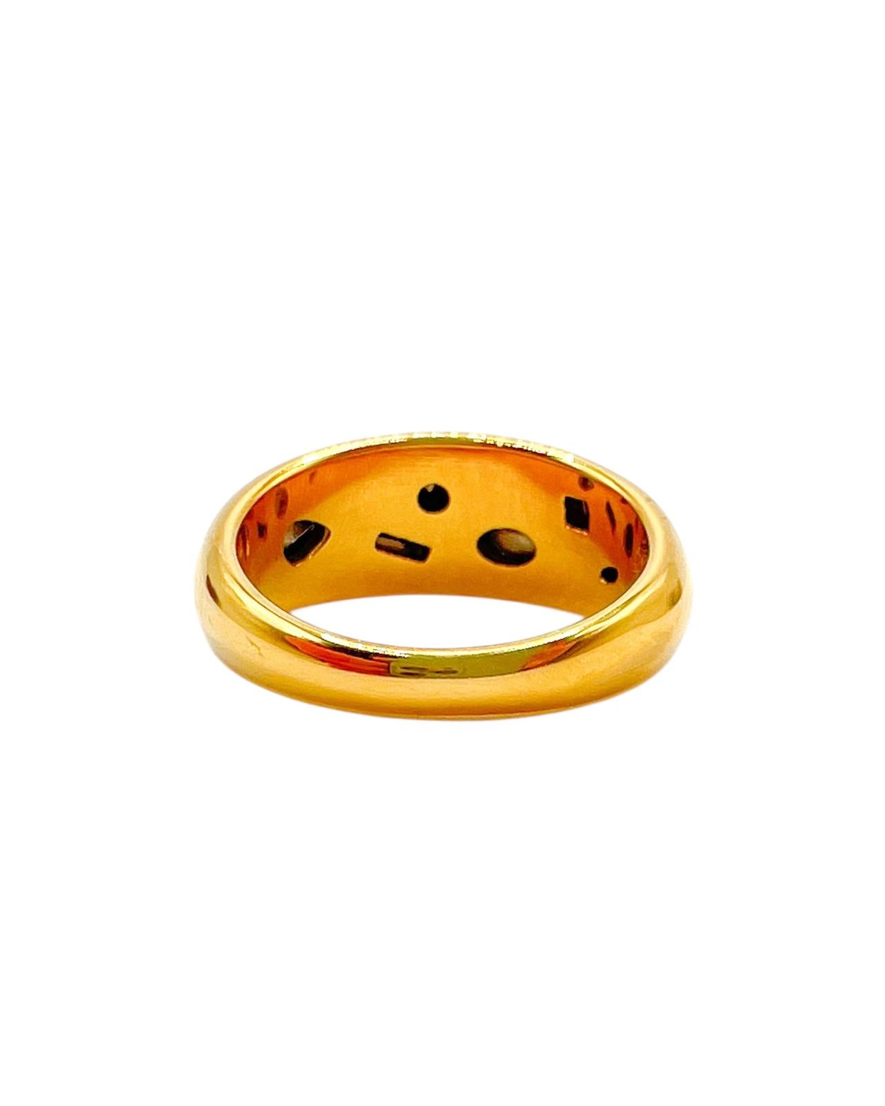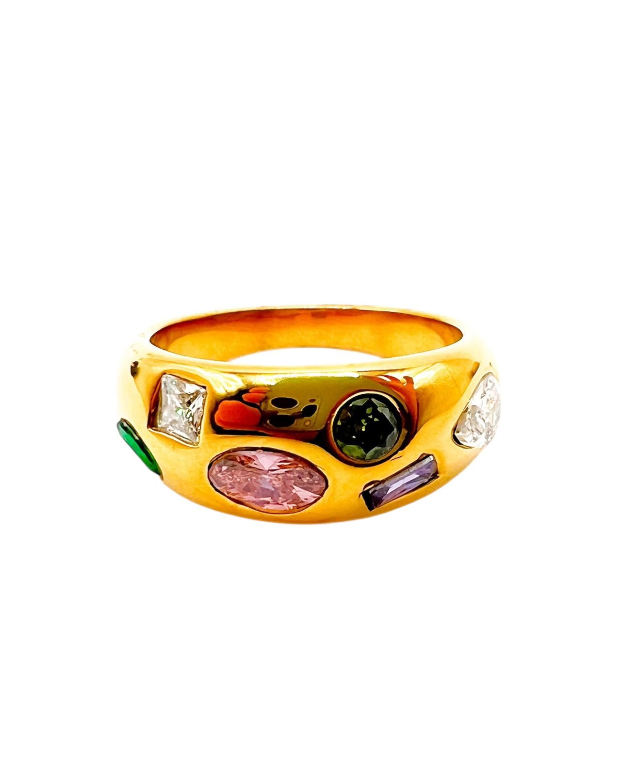 Anillo de acero inoxidable 304 con acabado dorado y perfil redondeado. Circonias de corte mixto en tonos blanco, verde, rosa y morado, incrustadas al ras para un brillo moderno y uniforme. Pieza durable y cómoda que añade un toque de color sofisticado.