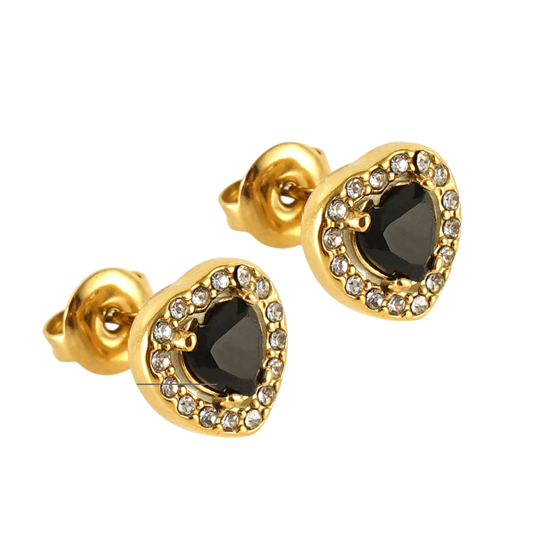 Aretes pequeños elaborados en acero inoxidable, chapados en oro de 18K y con recubrimiento PVD en tono oro. Su diseño de corazón color negro, acentuado con circonia brillante, crea un contraste elegante y sofisticado.