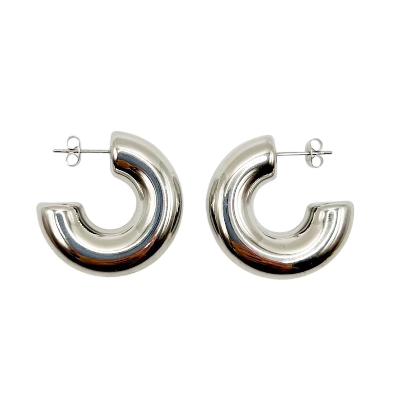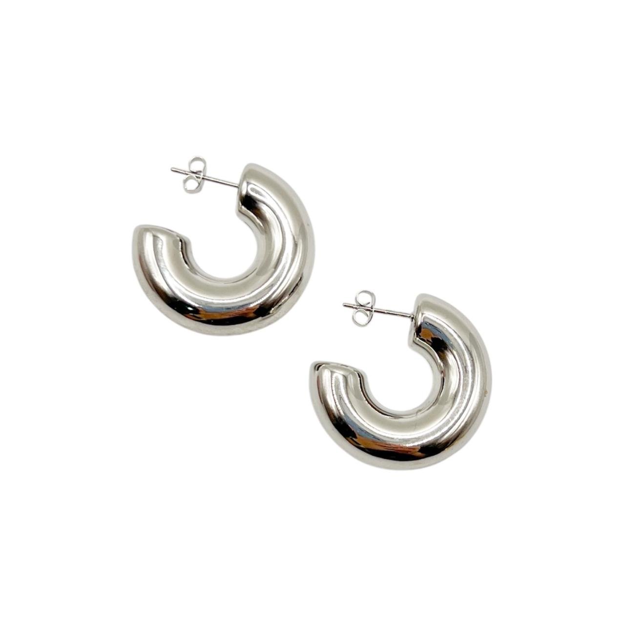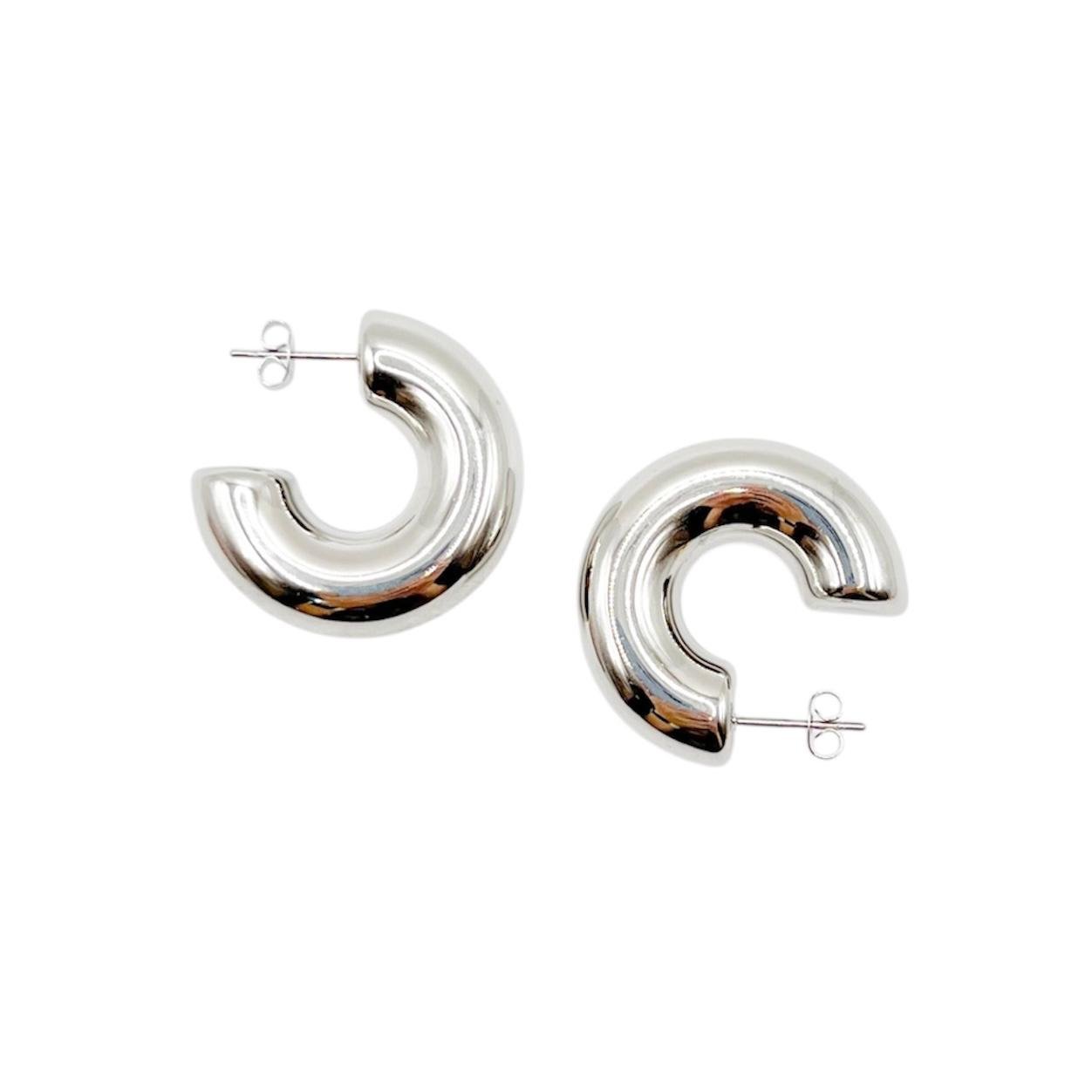 Aretes de acero inoxidable en color plata con diseño en forma de “C”. Un estilo moderno y minimalista, ideales para elevar cualquier look con un toque elegante y versátil. Resistentes, ligeros y perfectos para uso diario.