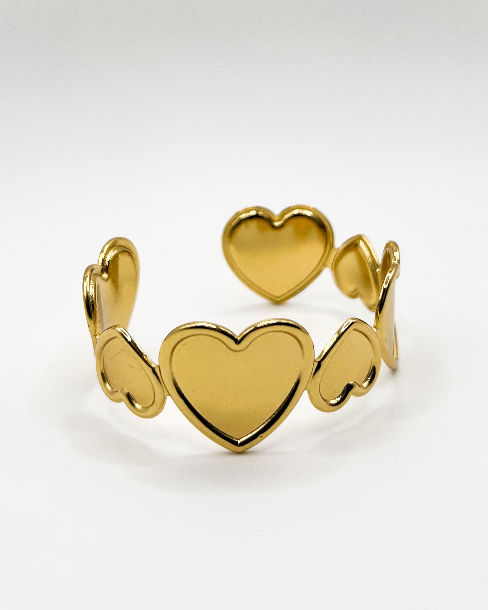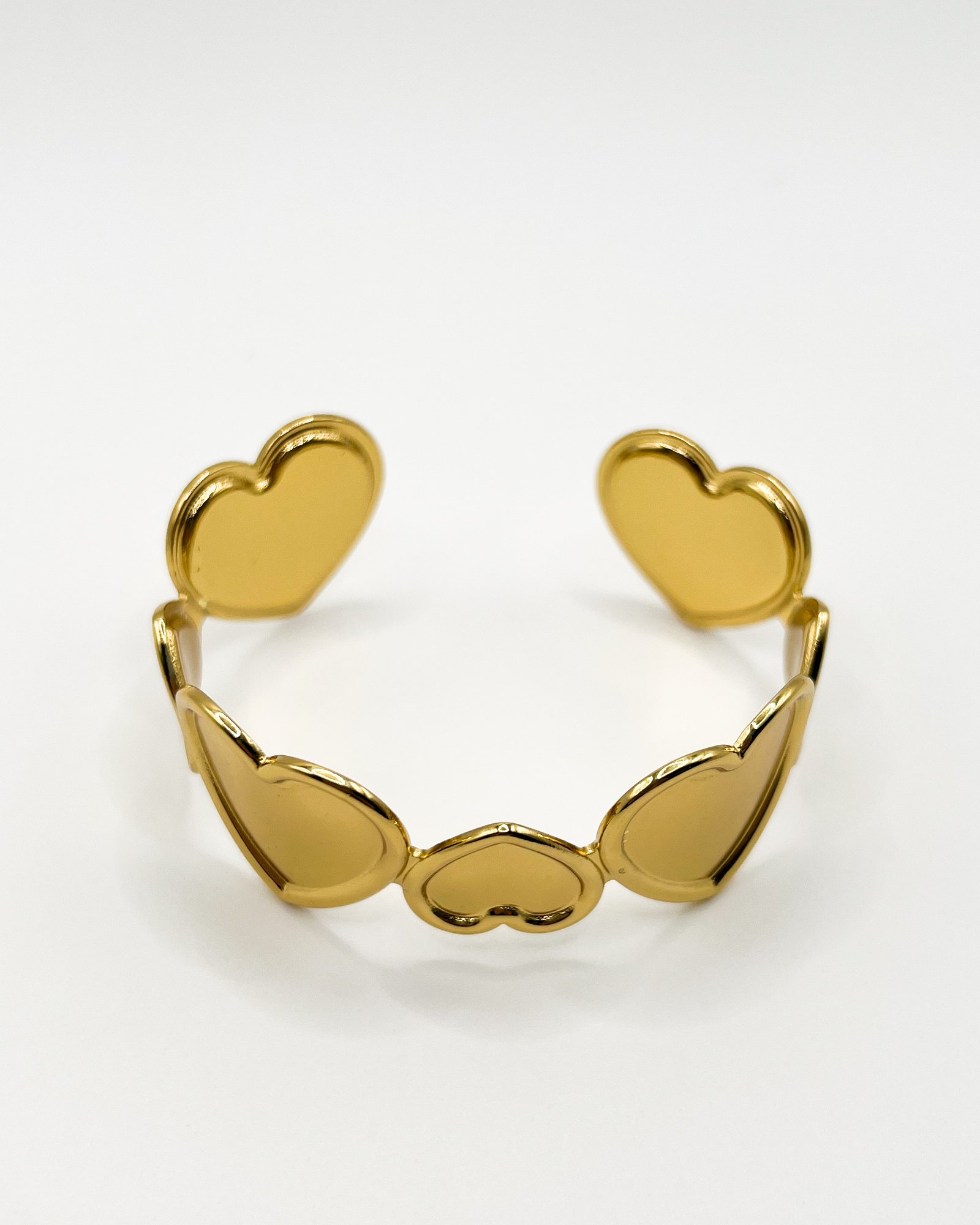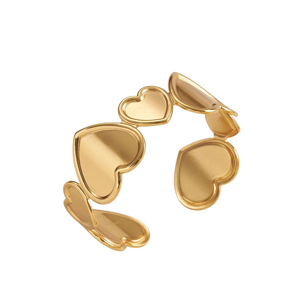 Brazalete elaborado en acero inoxidable color oro, con recubrimiento PVD, diseñado con delicados corazones que aportan un toque romántico y sofisticado.