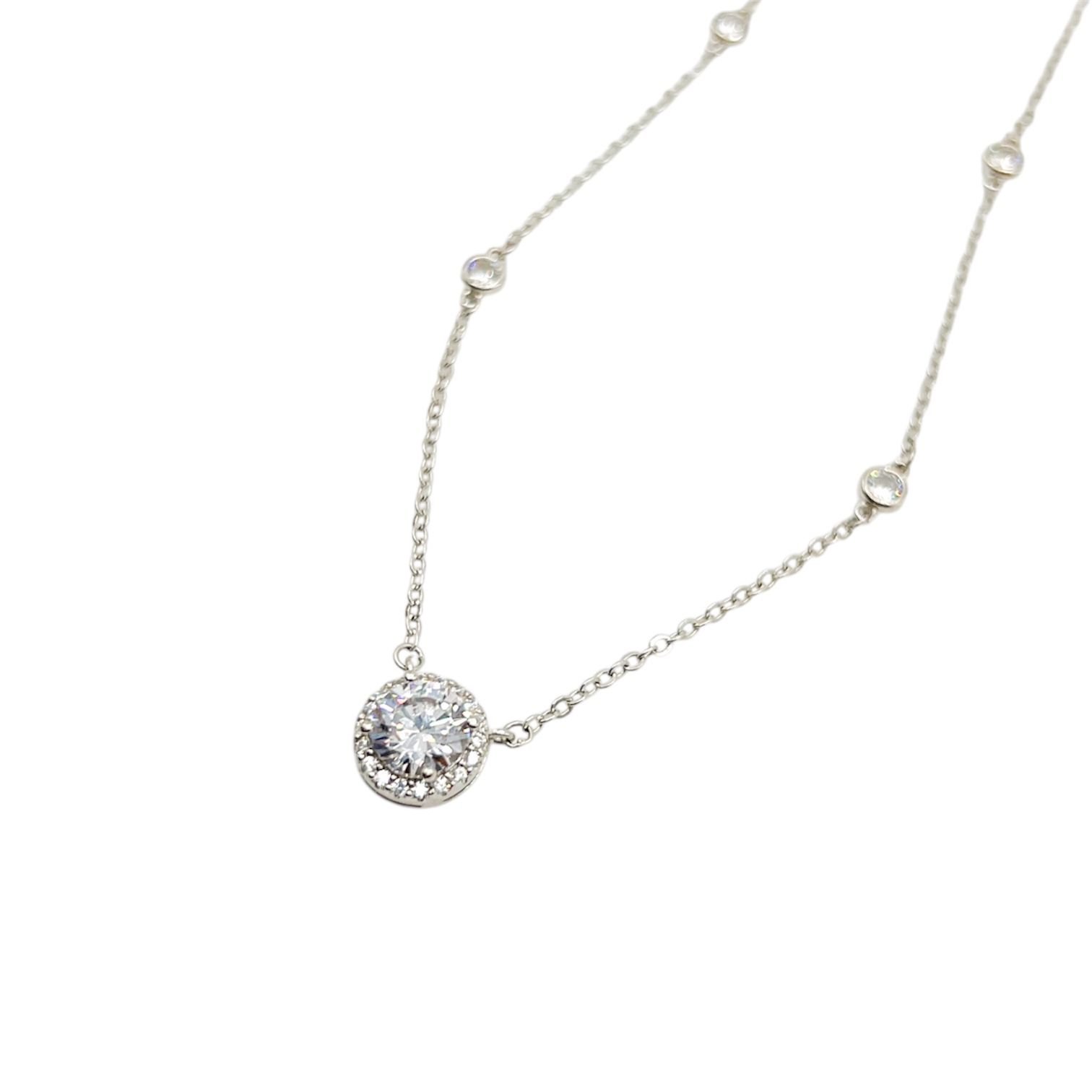 Cadena fina de plata 925 con estaciones de circonia y centro tipo punto de luz rodeado por halo micro pavé. Brillo intenso y diseño delicado, hipoalergénico y perfecto para usar solo o en capas.