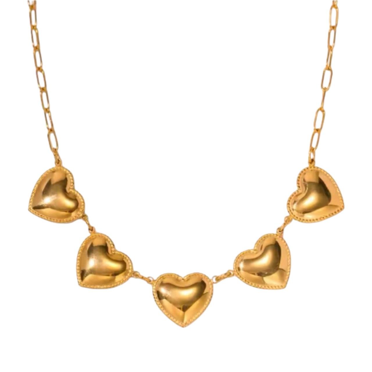 Collar elaborado en acero inoxidable color oro, diseñado con una cadena de eslabones que sostiene delicados corazones a lo largo de su recorrido, creando una pieza romántica con un aire moderno y sofisticado.