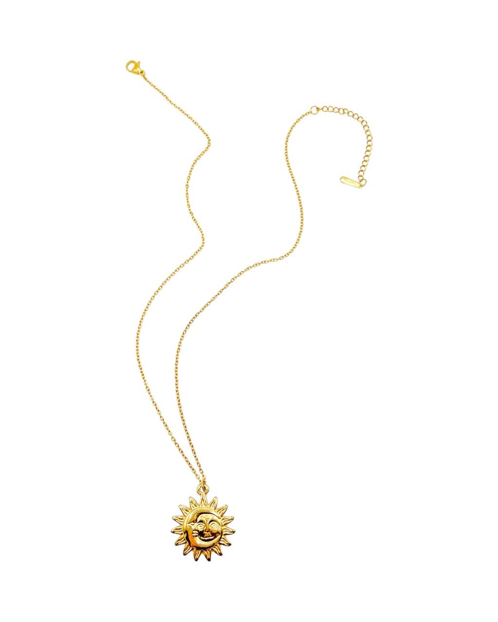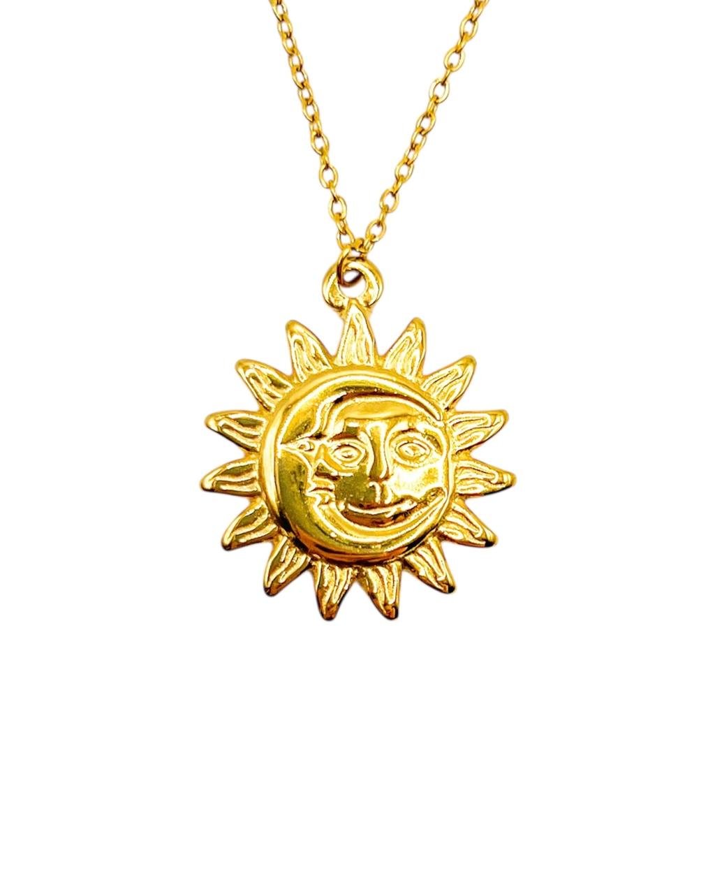 Dije de sol con luna en relieve sobre cadena fina de acero inoxidable con acabado dorado. Brillo pulido, hipoalergénico y resistente; una pieza simbólica que eleva looks de día o noche.