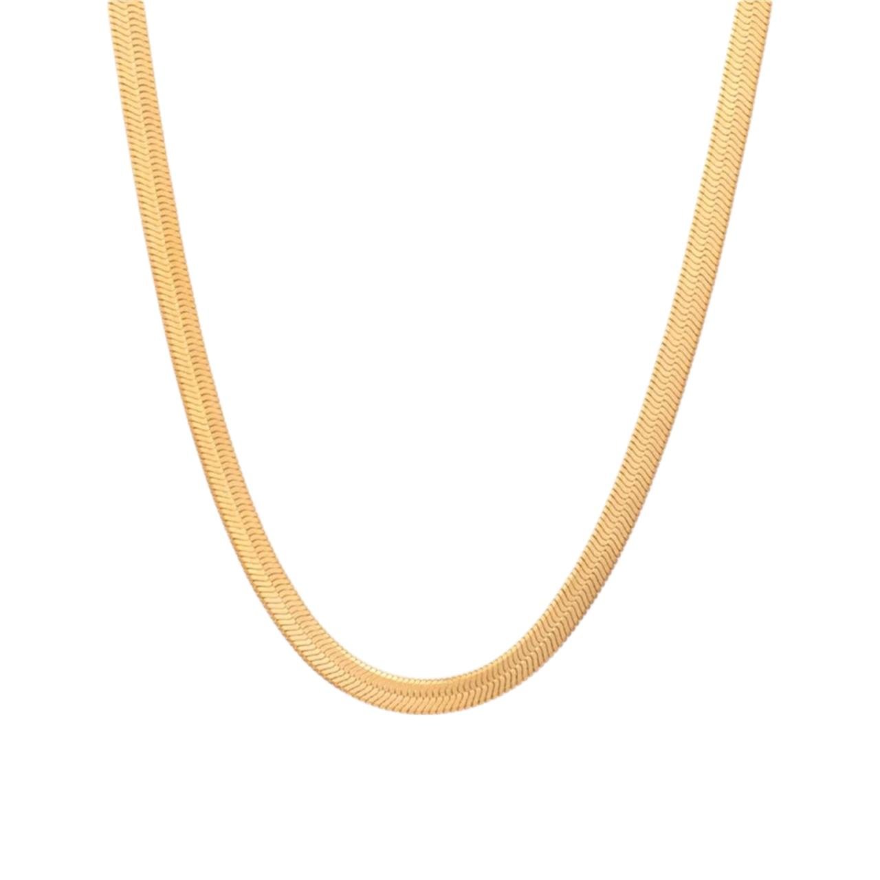 Collar tipo serpiente elaborado en acero inoxidable, chapado en oro de 18k, con un acabado liso y uniforme que refleja la luz de forma sofisticada.
