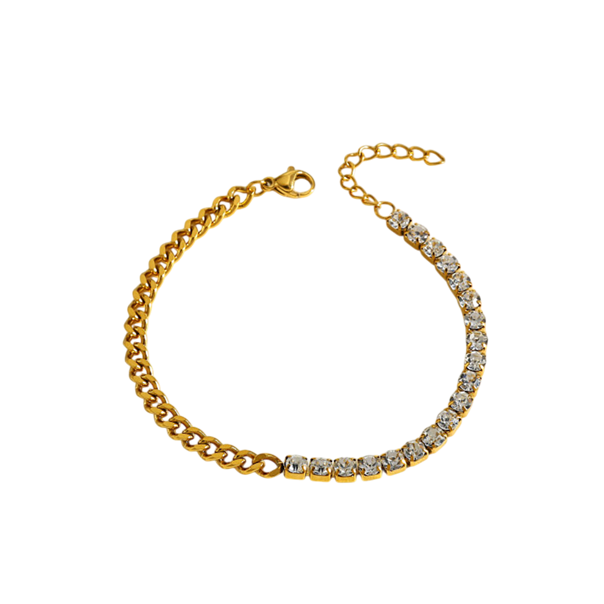 Pulsera elaborada en acero inoxidable con chapado en oro de 18k y recubrimiento PVD, diseñada con una composición dual: una mitad decorada con circones que aportan brillo y elegancia, y la otra mitad en estilo cadena, creando un contraste moderno y sofisticado.