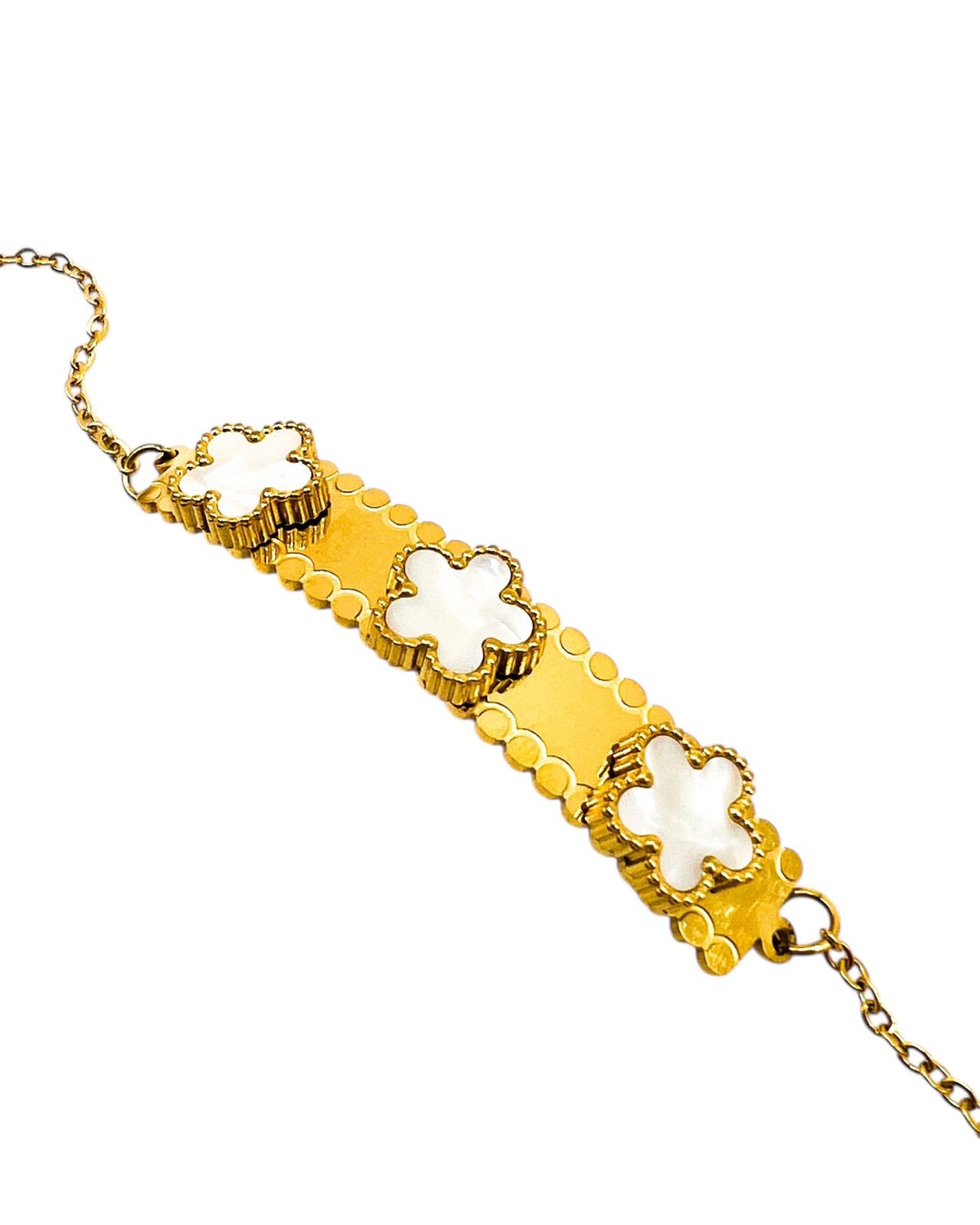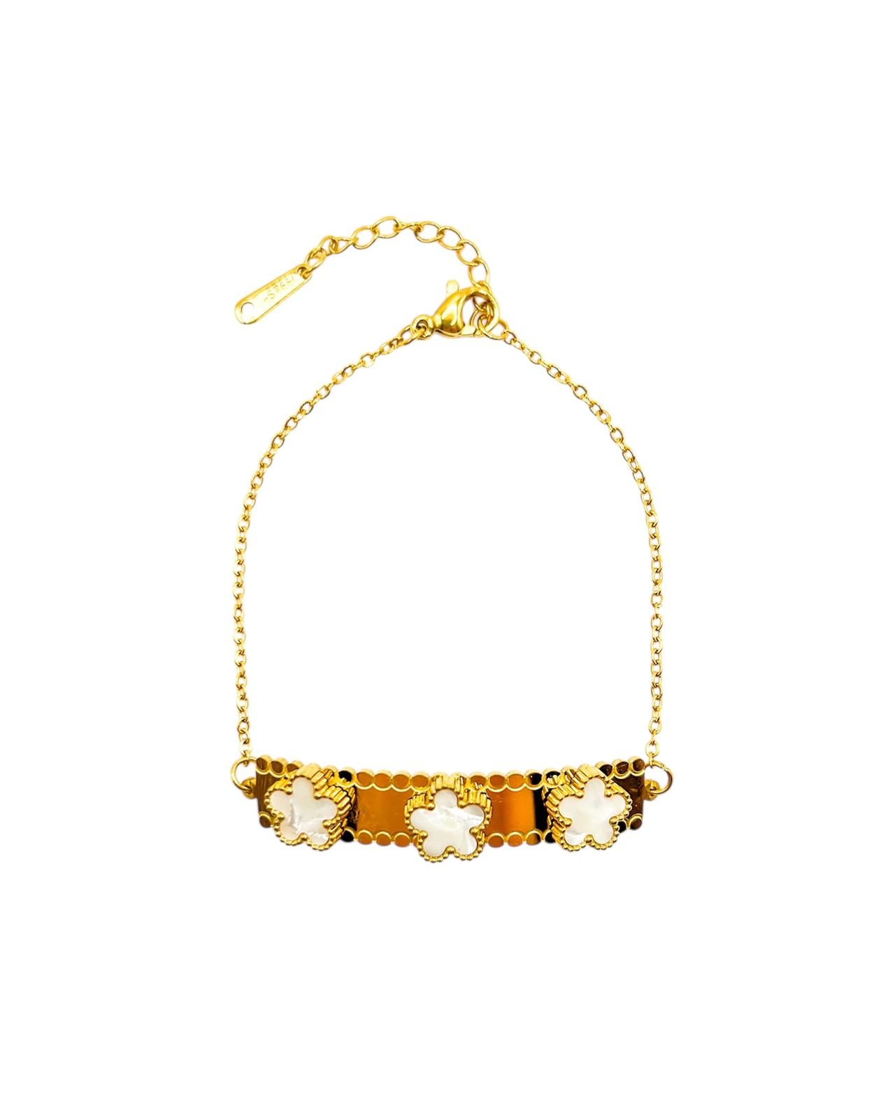 Pulsera en acero inoxidable 316 con baño de oro 18k y tres flores de madreperla iridiscente. Acabado espejo y perfil delicado; hipoalergénica y perfecta para elevar el look diario.