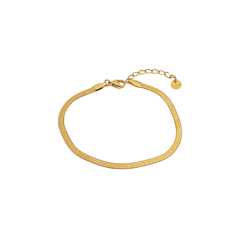 Pulsera elaborada en acero inoxidable con recubrimiento PVD en tono oro, con diseño tipo serpiente liso que se adapta suavemente a la muñeca, creando un efecto continuo y elegante.