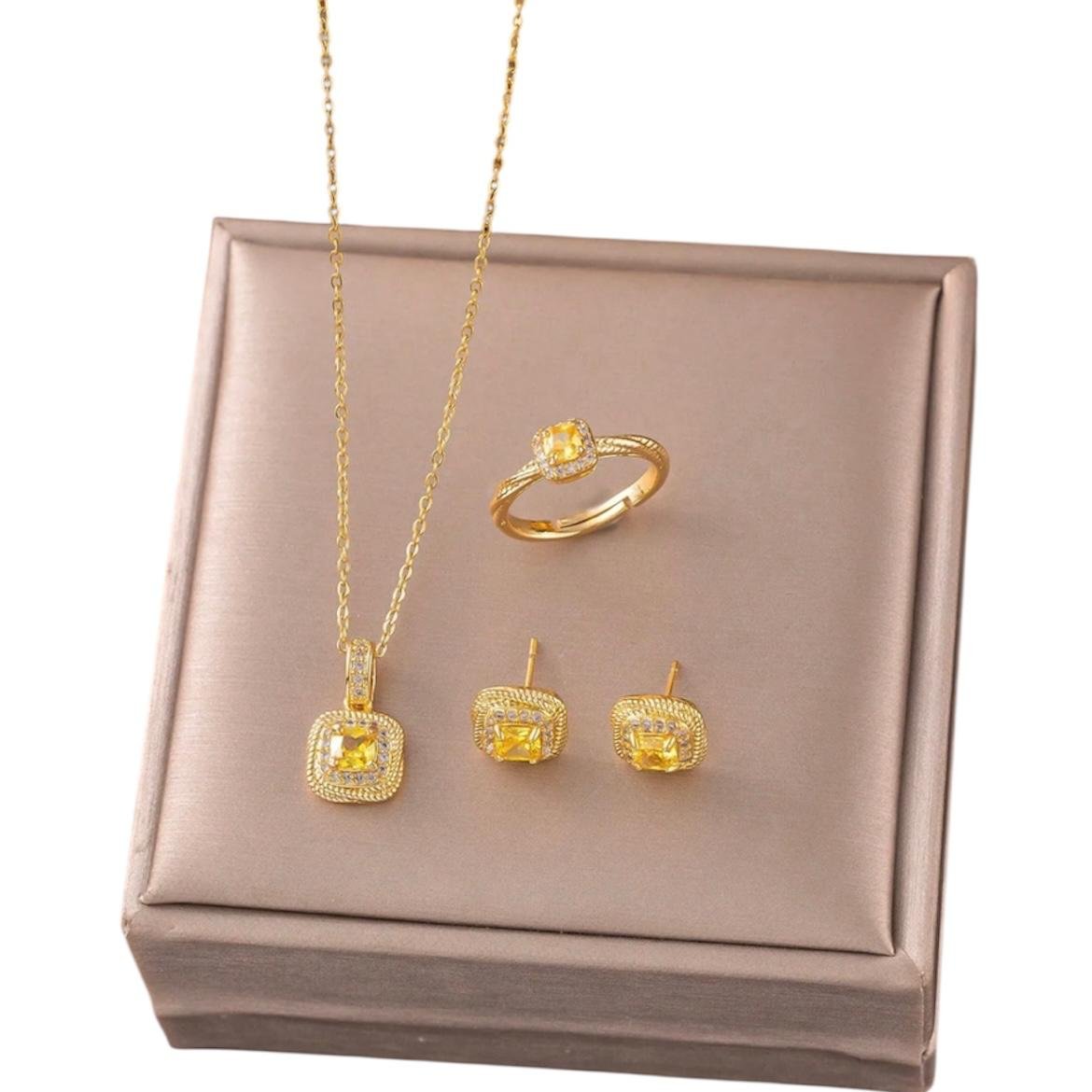 Set de joyería elaborado en cobre chapado en oro de 18k, compuesto por collar, aretes y anillo abierto ajustable, todos decorados con circones color amarillo que aportan un brillo cálido y sofisticado.
